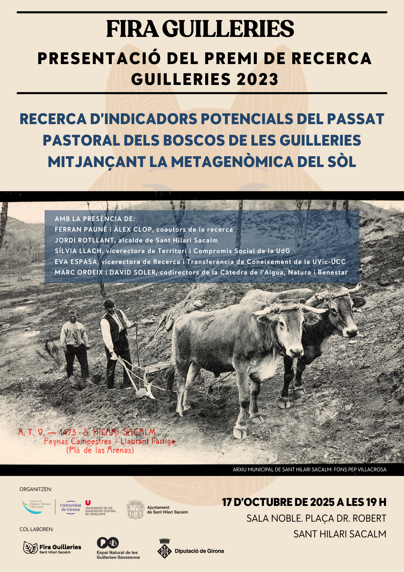 El pròxim 17 d’octubre de 2025, a les 19 h, tindrà lloc a la Sala Noble de la Plaça Dr. Robert de Sant Hilari Sacalm la presentació del Premi de Recerca Guilleries 2023, un acte emmarcat a la Fira Guilleries.L’estudi premiat porta per títol “Recerca d’indicadors potencials del passat pastoral dels boscos de les Guilleries mitjançant la metagenòmica del sòl”, una proposta innovadora que combina la recerca científica amb l’estudi del patrimoni natural i cultural de la zona.Els coautors del projecte, Ferran Pauné i Àlex Clop, presentaran els resultats deSEE DETAILS ...